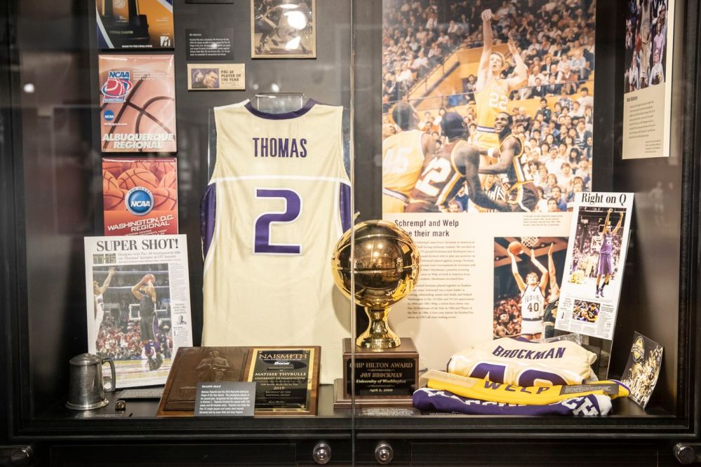 Matisse Thybulle’s award as defensive player of the year is pictured in the University of Washington Athletic Hall of Fame.