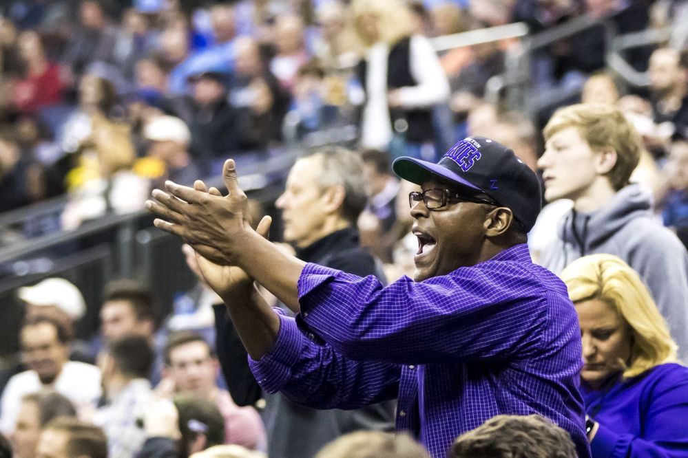 Greg Thybulle, Matisse’s dad, cheers on his son from the stands during Washington’s first-round NCAA Tournament game against Utah St. back on March 22 in Columbus, Ohio.