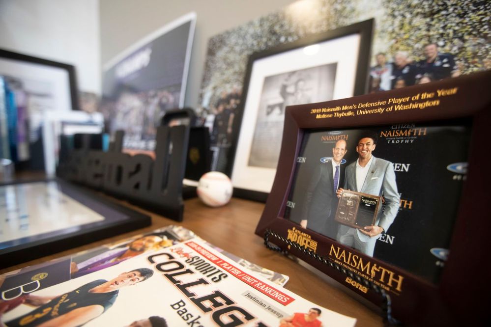 A photo of Matisse Thybulle and University of Washington coach Mike Hopkins at an event honoring Thybulle for his Naismith award sits prominently in Hopkins’ office.