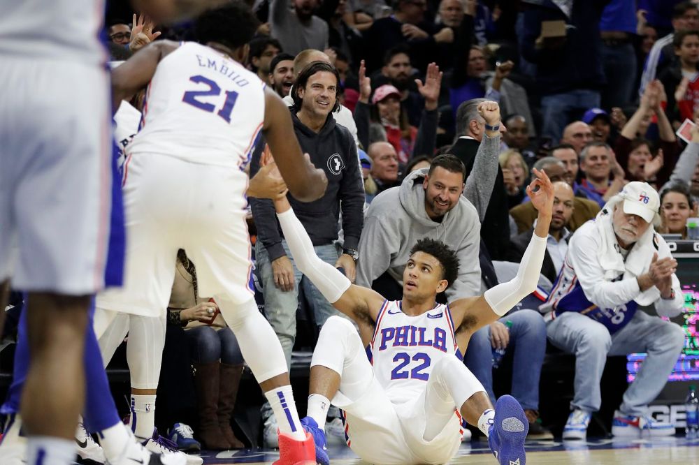 Matisse Thybulle getting off the deck with help from Joel Embiid after scoring against the Raptors on Dec. 8