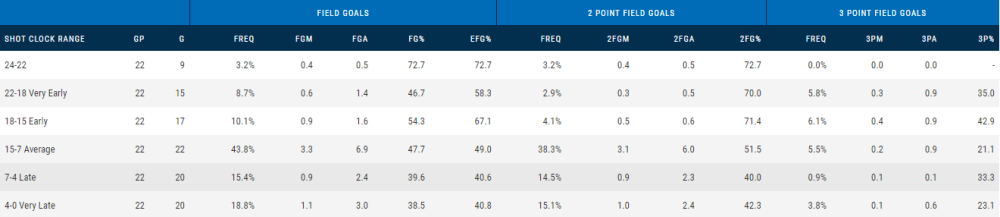En effet, l’embellie de début de saison n’aura été que de courte durée et il est vite revenu à un pourcentage dans ses moyennes en carrière (31,3%). Le volume est faible (24/76), certes mais l’hypothèse selon laquelle la valeur serait faussée par les tirs pris en fin de possession et le volume de mauvais tirs « » »obligatoire » » fait long feu.