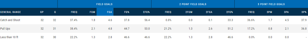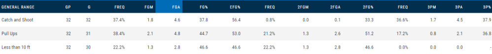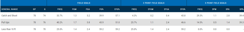 Premier point: il s’agit d’un joueur absolument et totalement allergique à la peinture: 0,15 lancer obtenu par tir tenté, 37% de catch and shoot, 38% en pull-ups, soit rien moins que 75% (!!!) de jump-shots !